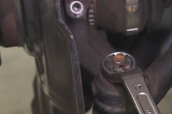 CONSEJO: En caso de que la tuerca gire con la rótula, presione la rótula más hacia adentro del brazo de la mangueta de dirección. La tuerca ahora puede aflojarse.